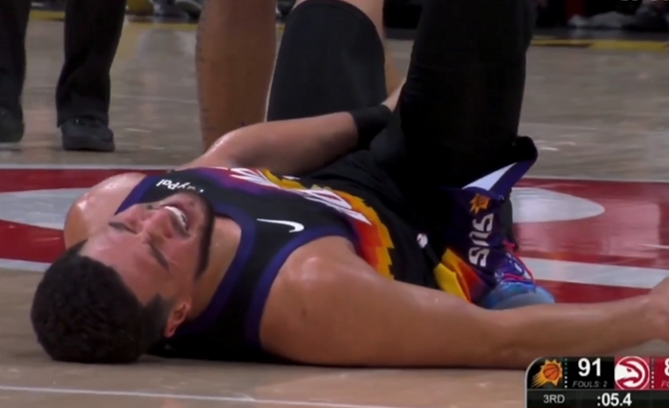 除了杰伦-格林外,太阳最麻烦是太子爷布克也在比赛第三节因伤退赛,慢镜头显示他跑动时踩到奥孔武德脚导致严重崴脚。